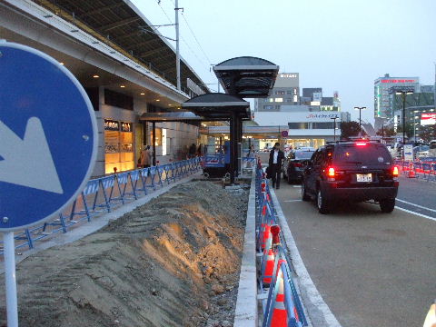 | ターミナルビル前でもバス停工事が始まっている。元々あった降車バス停を車道側に移動させている