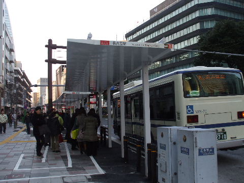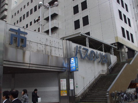 | ついに全館閉鎖され、バスの出入口もシャッターが降り表示類も殆ど撤去されている。 | 替わってビル前や周辺のバス停の使用が始まった。 |