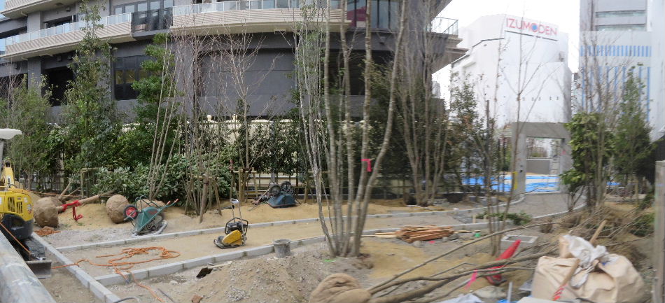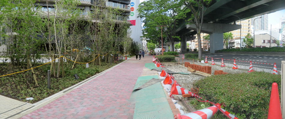 | 2023年04月16日。植栽等ビル周りの整備も終わりに近づいて作業車出入りに使っていた市道江川線の歩道の復旧工事。 |
