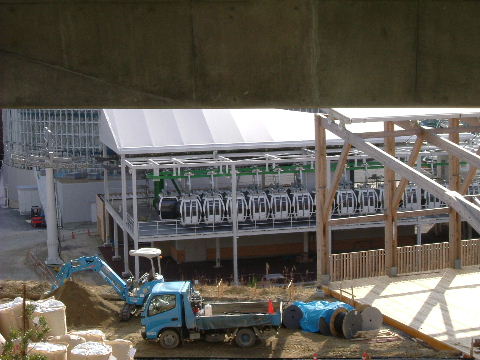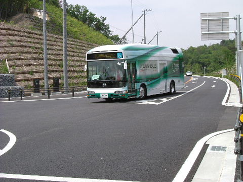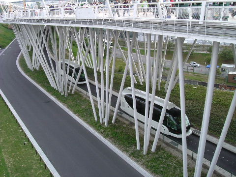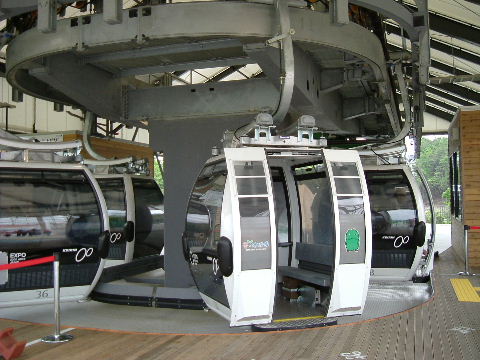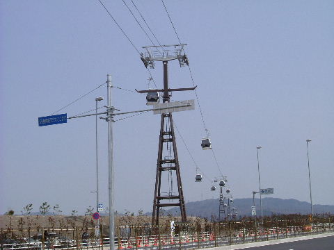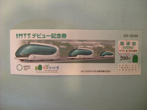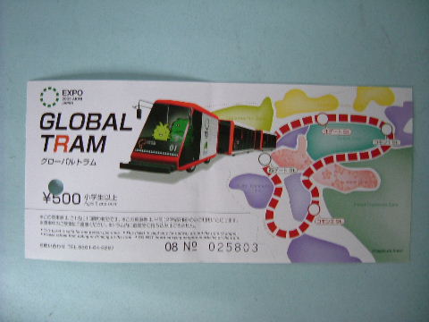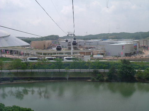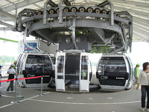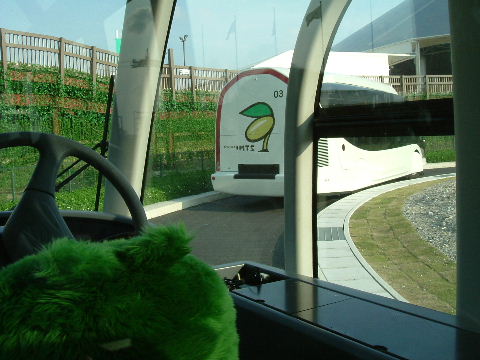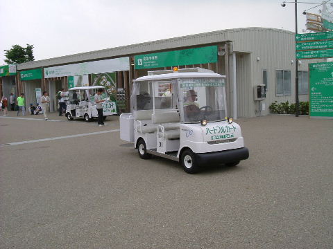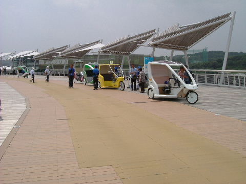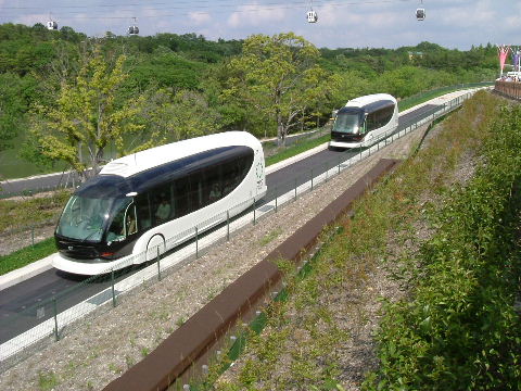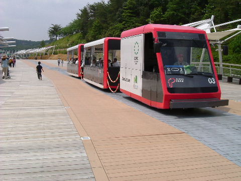 愛知万博会場の中の乗り物 二つに別れた会場を結ぶものと広い長久手会場内を移動する為のものがあった。 長久手会場⇔瀬戸会場 会場が二ヶ所に分かれていたのでこれを結ぶ乗り物が2種類あった。開催するほうの都合で生じる移動なのでどちらも無料であった。 水素を使う燃料電池バス。左は瀬戸会場から来たバスが八草東インターへ入り、長久手会場へ向かう所、右は瀬戸会場側乗場にあった水素ステーション。コースは万博八草から両会場へのシャトルバスのルートを合わせたもの。会場内同志を結ぶという事で両会場共他のバスのものとは別にそれぞれ専用の乗場が使われた。 モリゾー・ゴンドラ。左は県道や東ターミナルの上空を横切る。右は瀬戸会場側の乗場。 台風が来るとか、ロープを修理するとかいう時はこんな風にゴンドラが取り外される。これは開幕前のまだ工事中の時の様子。瀬戸会場近くでは一部民家の上空を通過するのでそのプライバシー保護のため右の写真の様にゴンドラの硝子窓にスモークがかかって全く外が見えなくなるようになっていた。他人と相乗りになった時は視線のやり場に困り、何か息がつまるような感じがした。 長久手会場内 グローバル・ループを右回りで回っていたグローバル・トラム。スピードは遅く、混雑しているときは前を人が歩いて露払いをしていた。つまり、時速5〜6?。 左は自転車タクシー。何種類かの型があったようだ。 右はハートフルカート。お年寄りなど足腰の弱い人が誰でも無料で利用する事が出来た。 左右共会場内で見かけた車で多分会場で働いている人の移動用のものと思う。 IMTS(Intelligent Multimode Transit System)。トヨタが開発したもので無人で縦列運転するバス。グローバル・ループの西半分の下を走行して北ゲート駅とEXPOドーム駅を結んでいた。又途中の西ゲート駅からはメッセ前停留所への支線が分岐していた。左はEXPOドーム駅を出たところ、右は西ゲート付近。 終点ではループをUターンする。自動運転だが運転席では真剣に前方監視が行われていた。途中から支線もでていてこちらは運転本数が少なく車両が長い時間停まったままになっていた。左はEXPOドーム駅ループ、右はメッセ前停留所。 キッコロ・ゴンドラ。長久手会場北端の北駅と南端の南駅を結んでいてこちらは有料。会場がよく見下ろせて眺めがよかった。左は北駅。右は車内から南駅方向を見ている。ちょうど下をIMTSが通っていく。 会場の外の乗り物を見る ついでに他のページもどうぞ