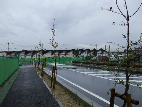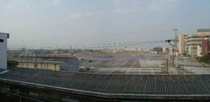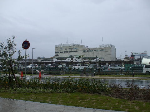 アピタ側から駅を見ると駅の向うの建物は全て向うを向いておりいかにも駅裏と言う感じ。見えている駐車場は「臨時」となっているので人出が落ち着いてきたらここにも何かできるのかもしれない。西隣にはオーミケンシののこぎり型の工場がまだあり元は相当広い工場だった事がわかる。