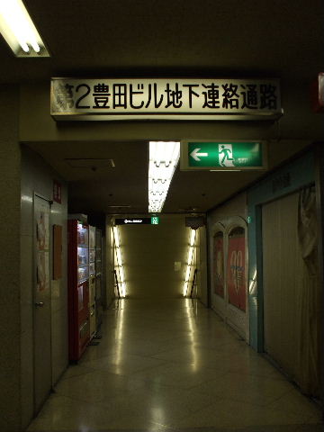 | 旧中経ビル地下から第二豊田ビル地下 への連絡通路。突き当り左の下り階段を 進む。東館へは地下駐車場の車道を横 切って行くという、知らずに行くと通っても いいのか不安になるようなルートだった。 |