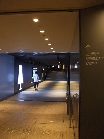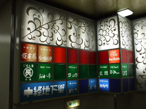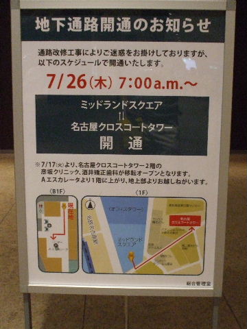 | ミッドからの地下連絡通路の開通案内板。 | 工事中も旧中経ビル地下手前のパチンコ 店入口までは行けたのがいつの間にかミ ッドを出てすぐの所にシャッターが降りてい る。通路改装中と思われる。パチンコ店か ら流れ出る煙草の匂いがいつも充満してい る所だったが折角新しい飲食店街へ行く手 前が煙草臭くては興醒めだからそれが改 善されるものと期待する。 |