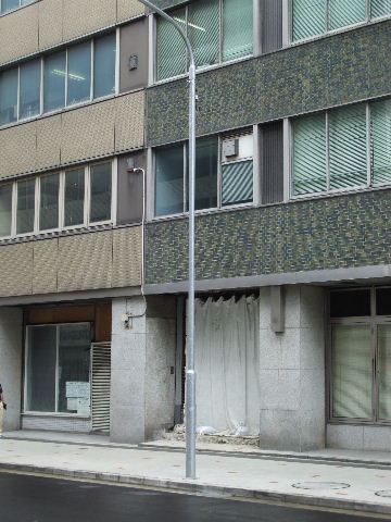 | 左中経ビル1階に解体業者等の表示、 右第二中経ビル1階は一部壊してシー トで覆ってある。 |