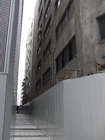 | 西から見ると産労の壁が目立つ。 | 産労側から見る。奥は第二豊田ビル西館。 | 西隣のビルの汚い裏側が見えるのも今の うち。 |