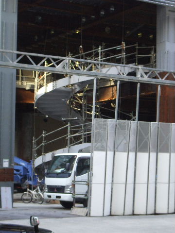 | 一番上の外壁のみ。 | 上の方の外壁取り付け進む。工事塀が低 くなった。 |