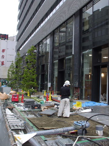 | タイル貼りが進む。 | 塀が無くなって産労との間の通路も見える ようになった。 |