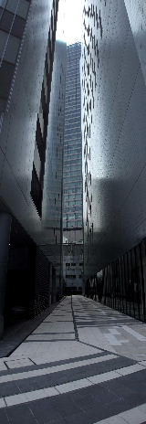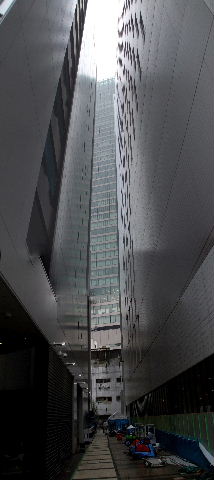 産労との間の通路。17階に挟まれて47階を見 上げる。 |