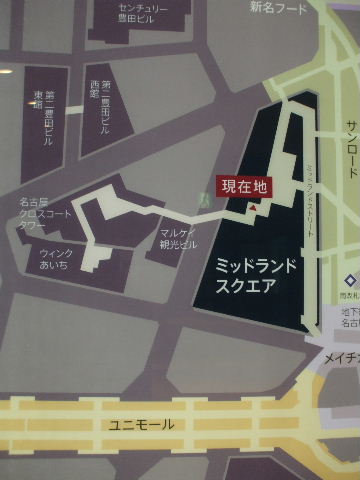 | ミッドから地下通路への出入口に掲出さ れている地下通路の案内板。第二豊田ビ ルが建て替えられるとセンチュリー豊田ビ ルを介してミヤコ地下街までつながる事に なっているようだ。 |