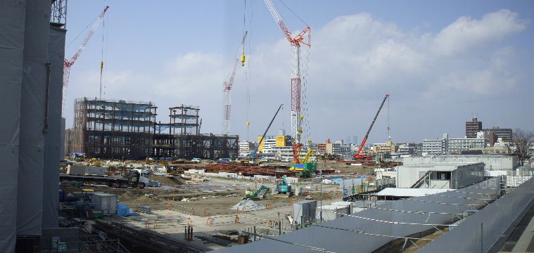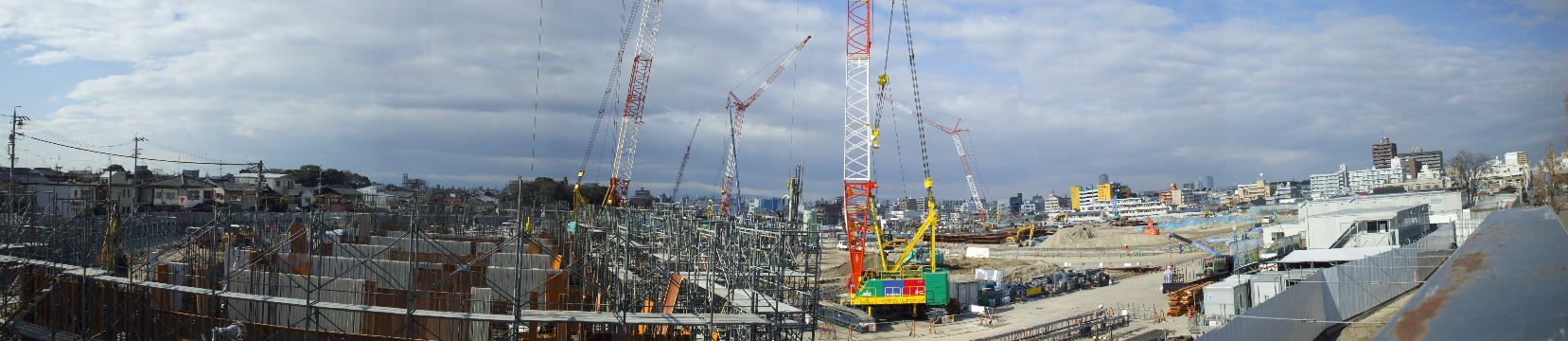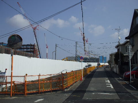 | 2009年2月14日。マンションは左、目の前に立ちはだかってきた。元の計画より背が低くなった分横へ広がったような感じ。イオンの方は鉄骨組み立てが進んでいる。 |
