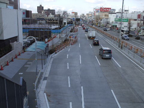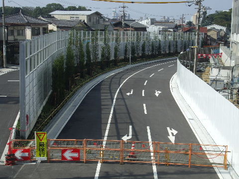 | 2009年10月18日。渡れるようになった歩道橋から 南沿いの道を見る。元の道が駐車場へ入る道から分岐 するような形になり、その間に防音壁が立っている。 |