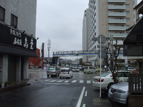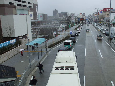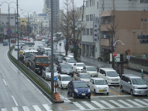 | 2010年3月6日。左端一車線に駐車場へ入る車が並び 誘導し損なうとバスがバス停に近づけない。 |