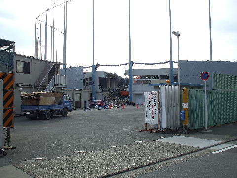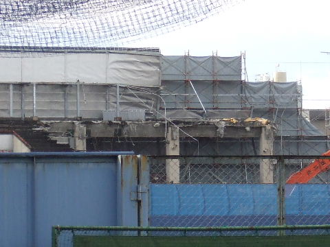 | 2009年9月27日。この高いスタンドが無くなる。 | 2009年11月28日。後で増築された高い部分はかなり 撤去され一番後ろの壁だけといった様子。 |