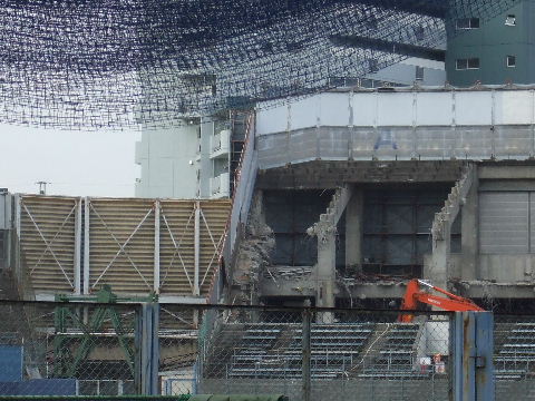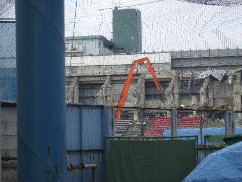 | 2009年12月19日。ライトスタンド撤去中。 | 2009年12月19日。一塁側の高いスタンドが撤去 されて三塁側と同じ初期の頃のスタンドが姿を現した。 |