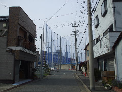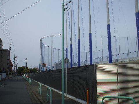 | 2010年3月13日。ネットの支柱は外野はコンクリート柱。 高い飛球が来る内野は鉄柱にコンクリート柱を継ぎ足して 高くしている。 |