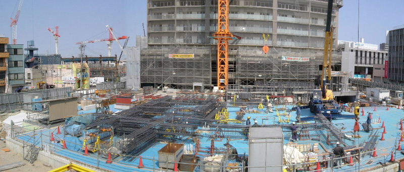| 2007年3月21日。あまり行く機会のない所で久し振りに通ったら既に10階から11階に掛かり始めている所。ビルの前のスペースで鉄筋を組み立てている様子。 | |