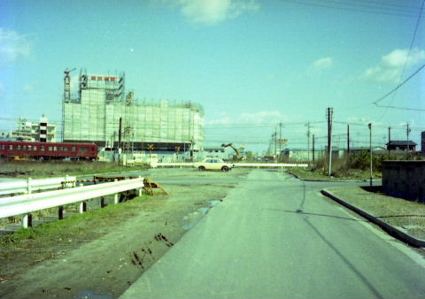 ? 1978年 名古屋市中川区と中村区の境界線になっていた線路も2005年になってやっと全線が高架になった。南北から延びてきた道路もここで分断されていた。端のほうに歩行者が渡れるだけの小さい踏切があった。線路際にある病院がちょうど建設中。