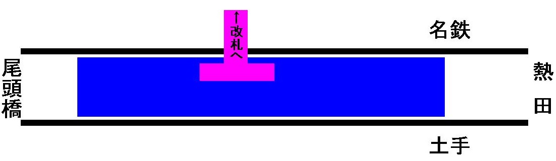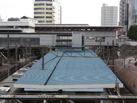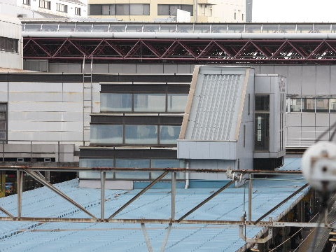 | 左、上り線寄りのガラス張り三段になっている所が開業時からの もので熱田方へ階段、尾頭橋方へは 階段とエスカレーター一基 がある。下り線側を空けて置く為に上り線側に偏って設置されて いるのが判る。右の斜 面屋根の部分には後に追加されたエスカ レーターとエレベーターがある。 |