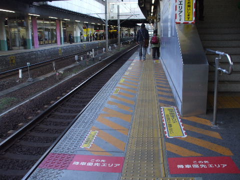 | 将来の為に階段を片寄せて作ったのが今となっては仇となり上 り線側は黄色い線の内側に1人分のス ペースしかなく降車優先 エリアに指定されている。 |