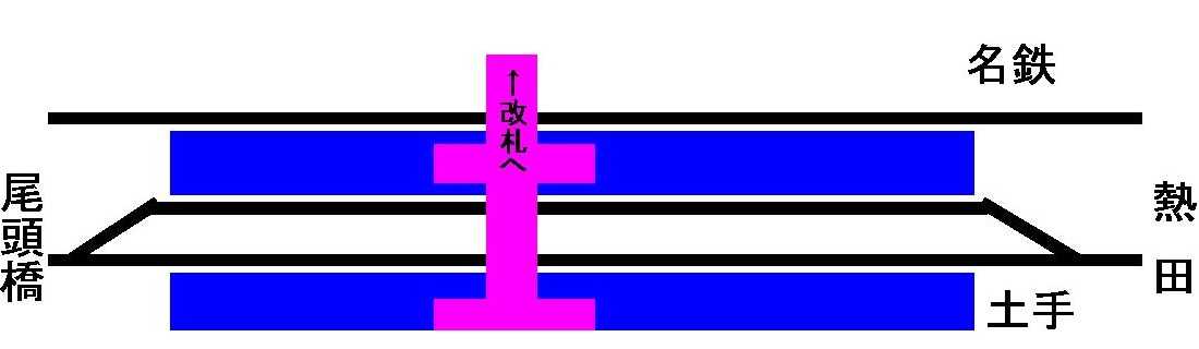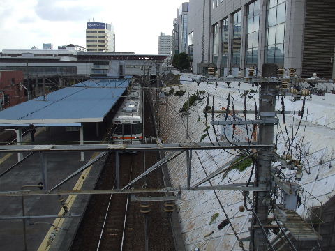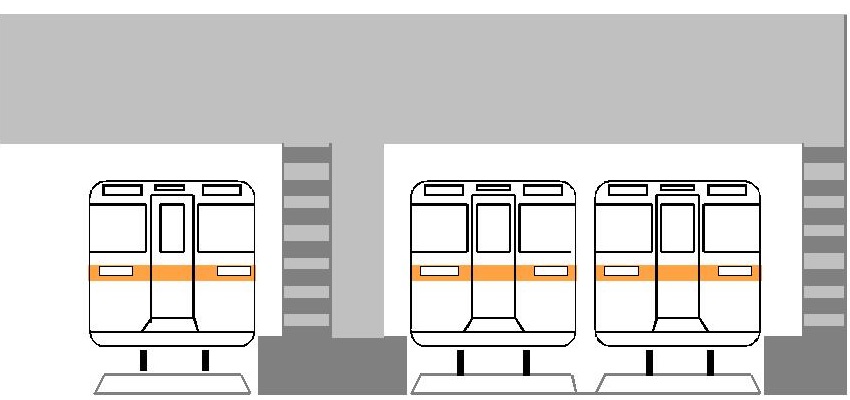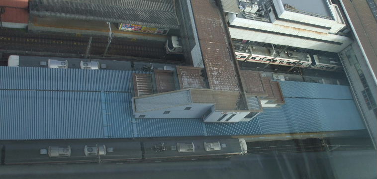 | 上から見下ろすとよく判る。画像下方、下り線に停まっている電車の幅で屋根をカットすると最初からあ
