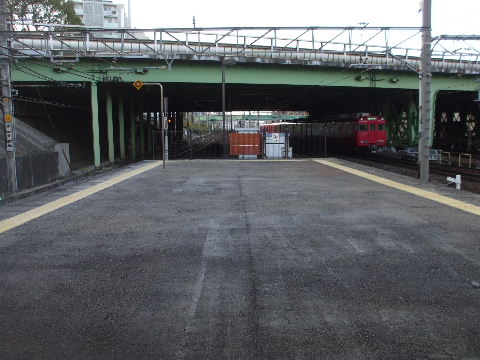 | ホームも準備が出来ていて端から見ると下り線側が撤去し易い ようにホーム下が最初から空洞にして ある。右側の軌道幅と同 じだけ空洞になっているのが判る。これは尾頭橋方で金山新橋 から見下ろす。 |