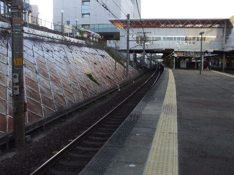 | 熱田寄り。中央線のホーム側は垂直の壁になっておりこの斜面 には余裕を感じる。壁を垂直にすれば ホーム幅が充分確保でき る。 |
