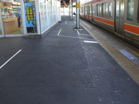 | 今はホーム中央にある売店。 | 開業時はきしめん店でやはり上り線側に寄った所にあった。ホー ム面にはその跡を埋めたアスファル トの線が残っている。 |