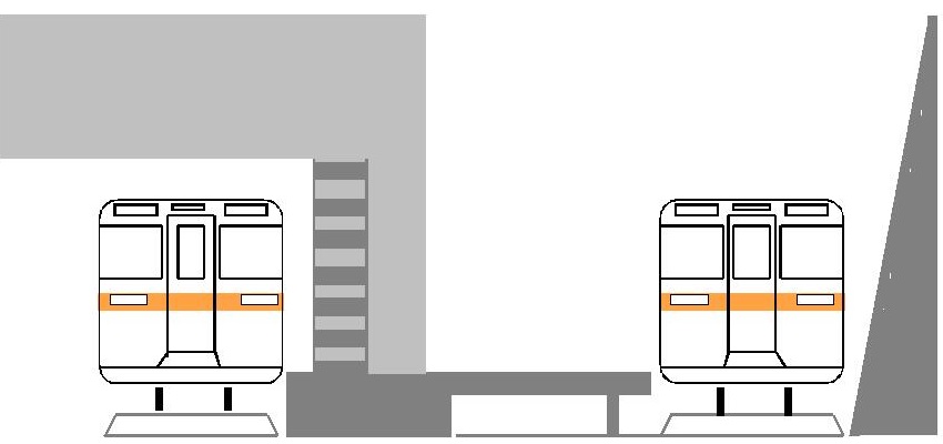 る3段 の屋根の階段がちょうどホーム幅の中央になるように作ってある。 |