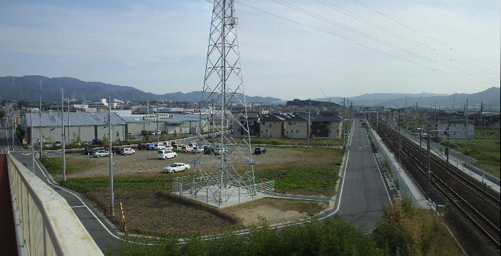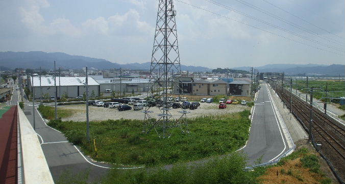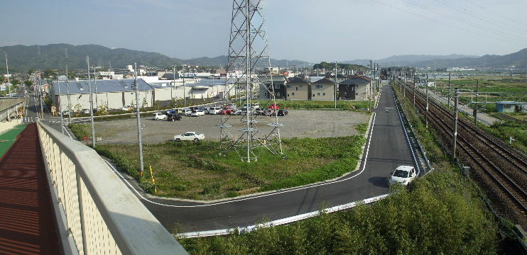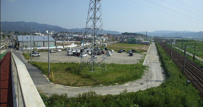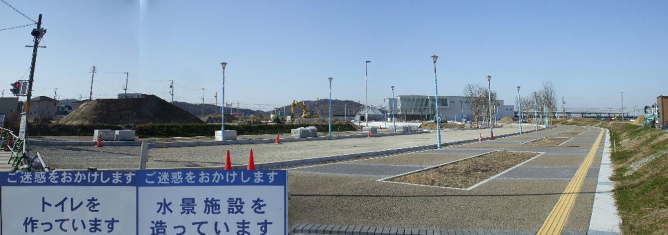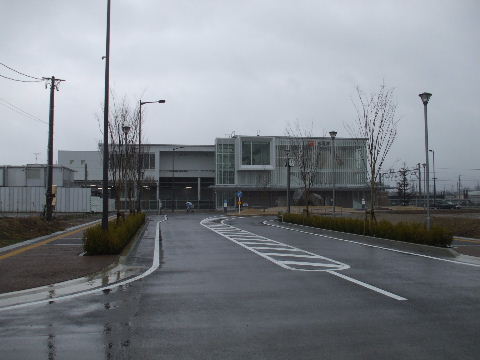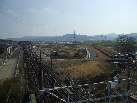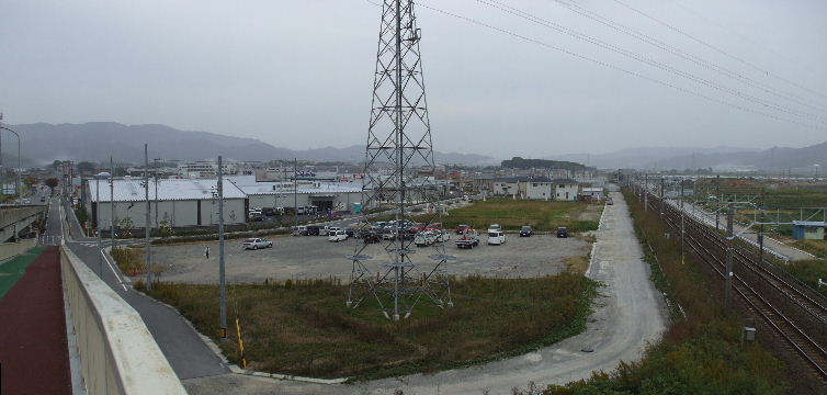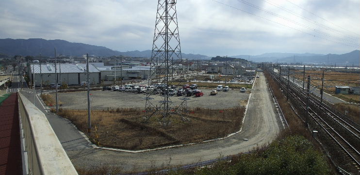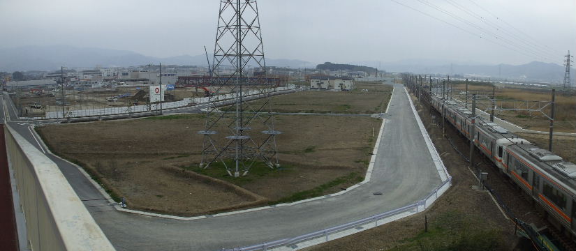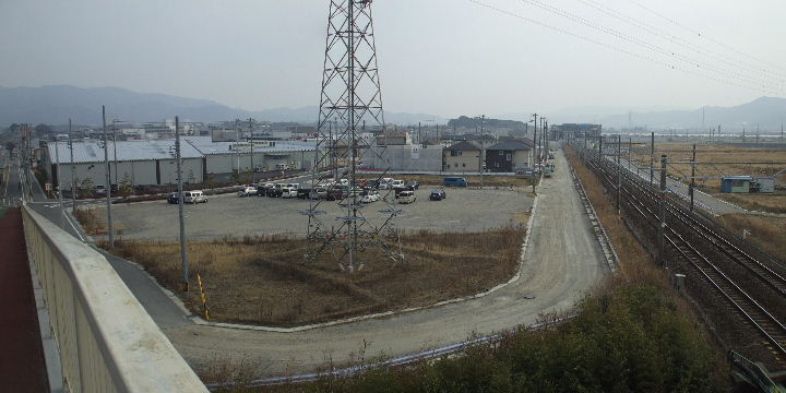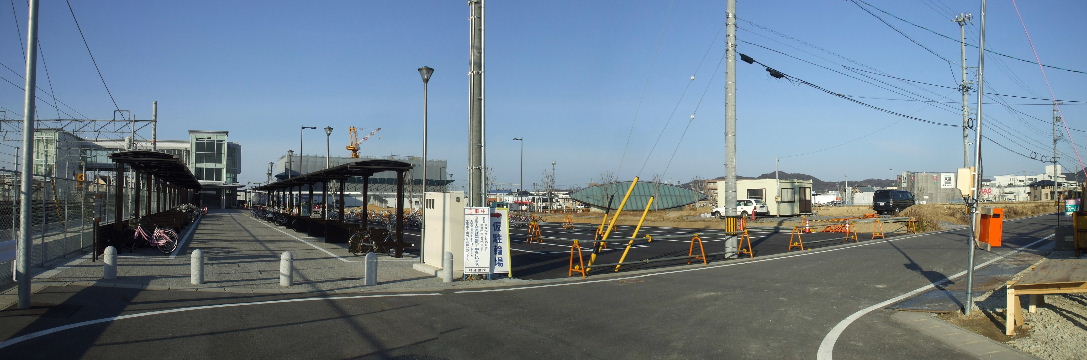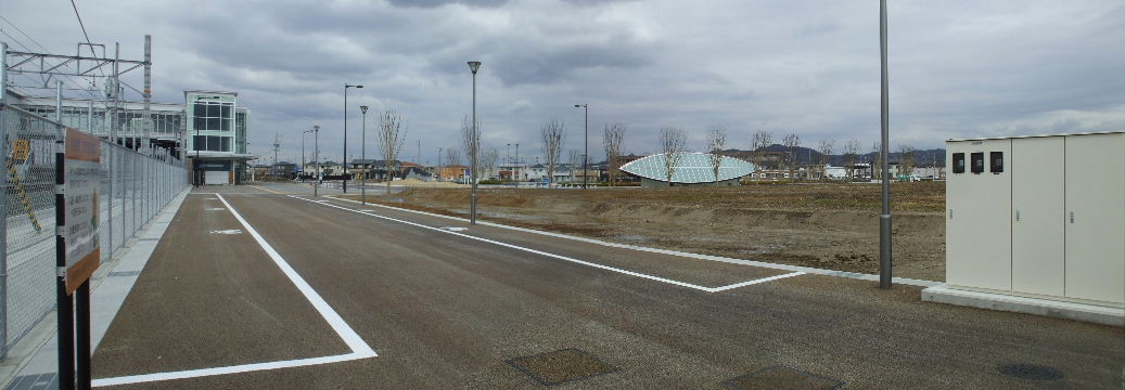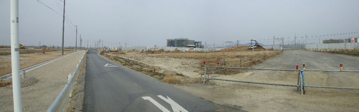 | 2012年3月17日。西側はまだ駐車場以外何もない。電柱は立っているが電線はまだ張っていない。線路沿い