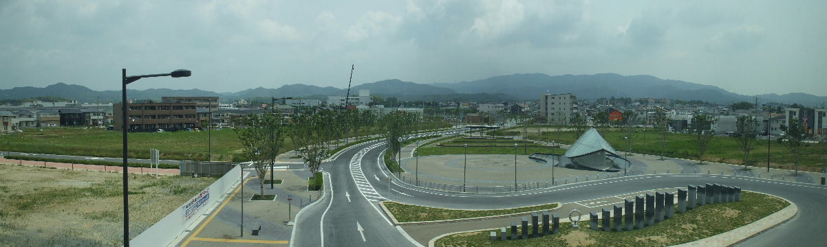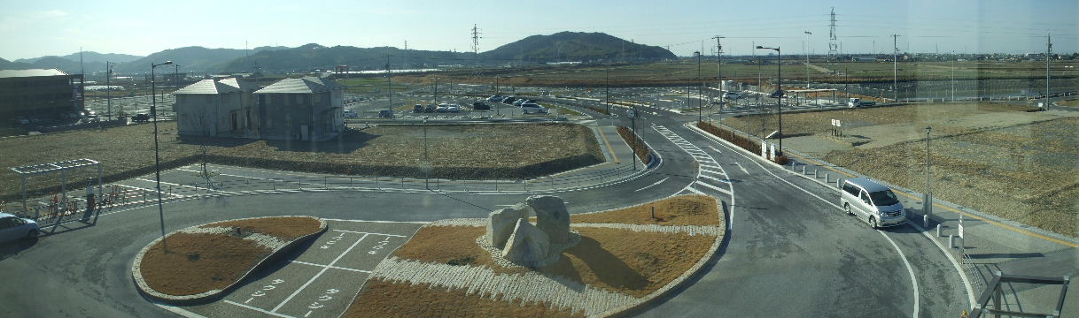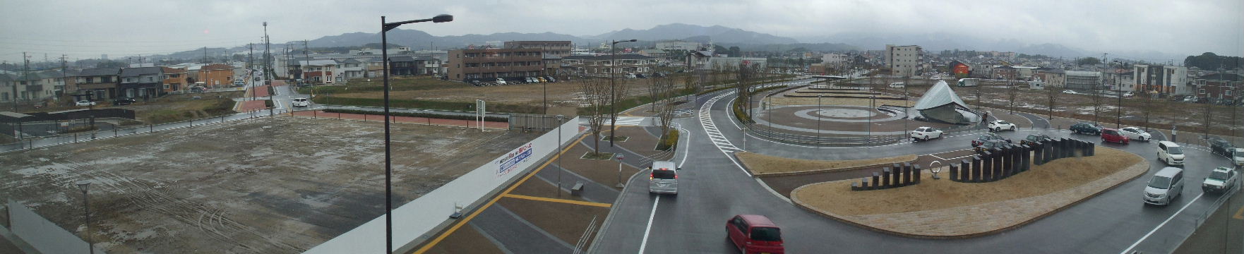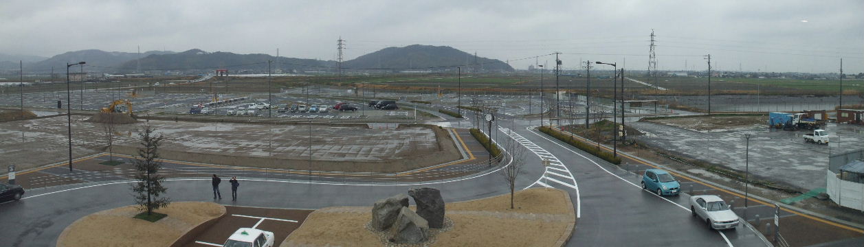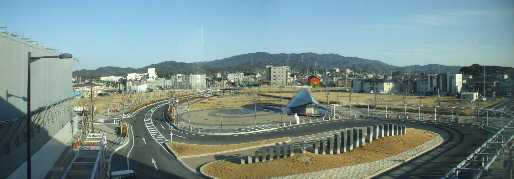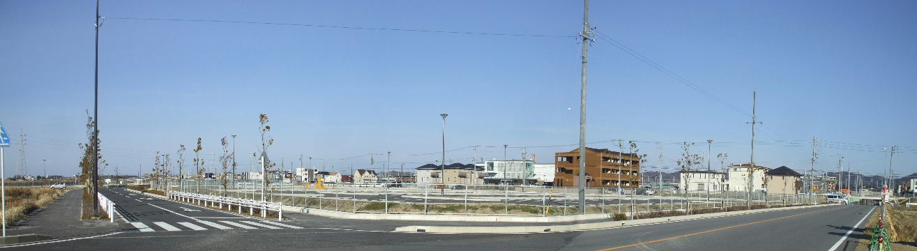 | 2012年3月17日。駅通路から東を見る。駅前の通り沿いは駅工事をやっていたからかまだ建物がないが周囲