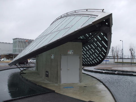 | 2012年3月17日。笠を被っているような東口駅前広場のトイレ。