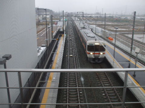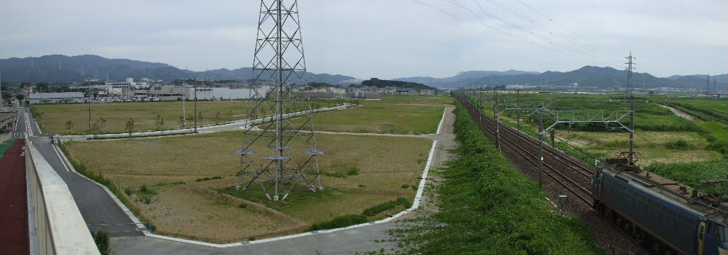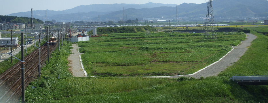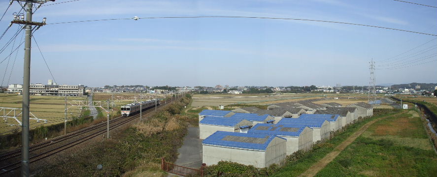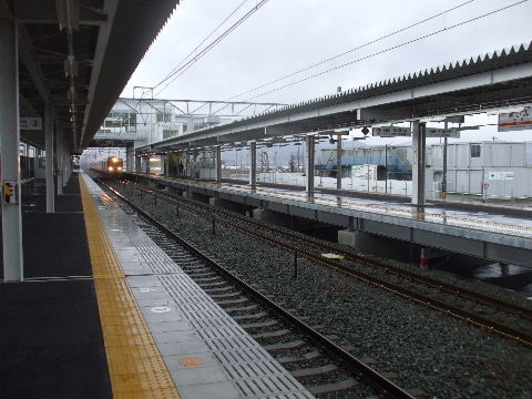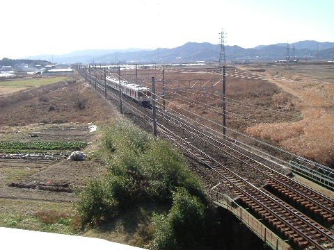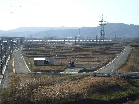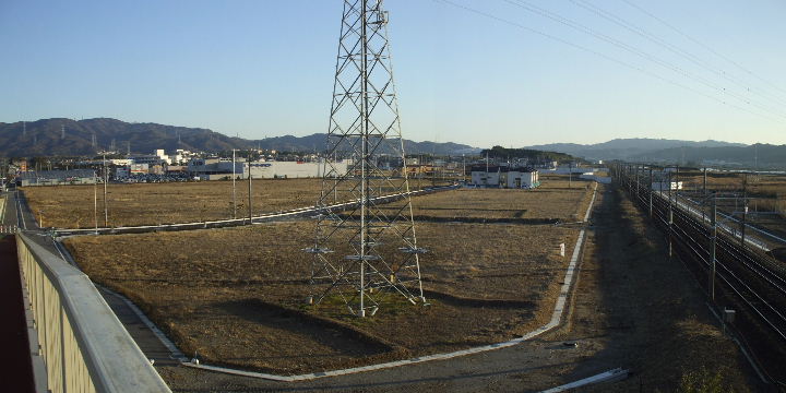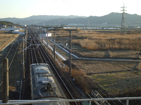 | 2005年12月29日。電車がいる辺りが予定地と思われる。線路の東(左)側は田畑、西(右)側は荒地の状態。