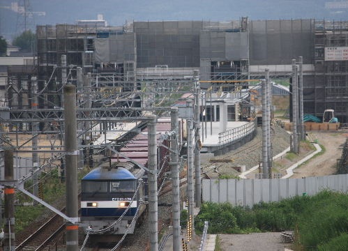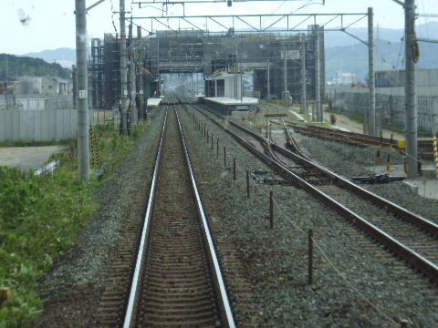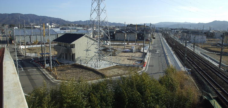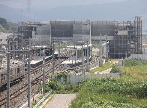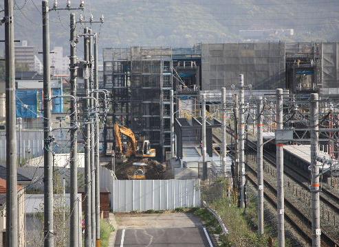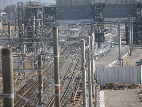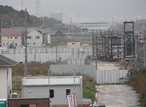 る。奥で駅建設中。右寄りに見えている住宅は線路東側のもの。
