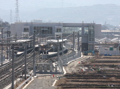 | 2009年12月29日。西側でも造成工事が始まっている。駅工事予定地が塀で囲まれているのが見える。