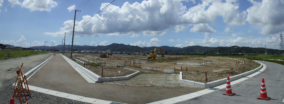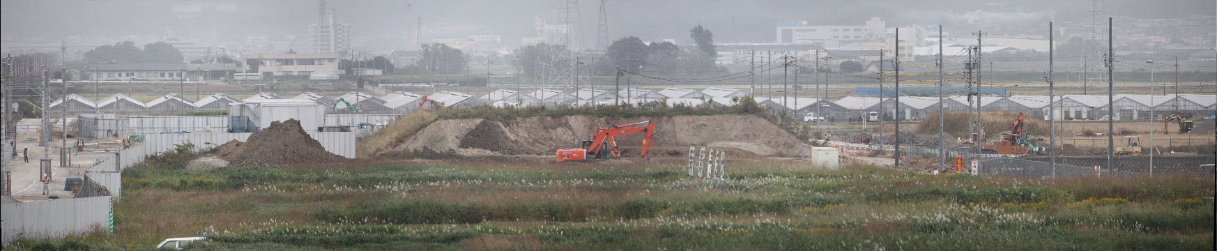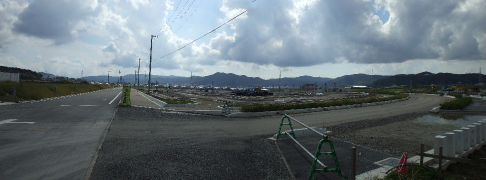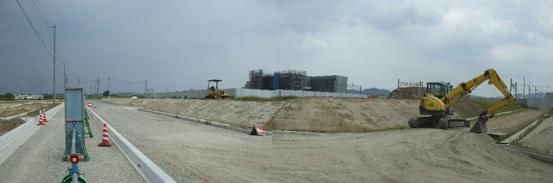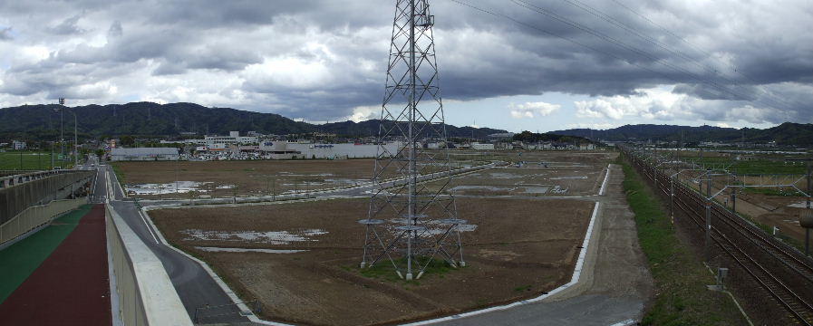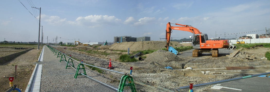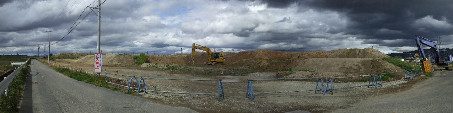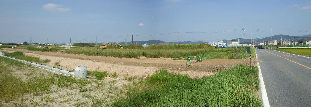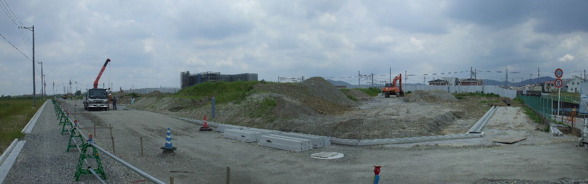 | 2010年9月11日。更に離れた南西から見る。駅前造成地の西側の水田でも造成工事中。敷設中の下水管が見