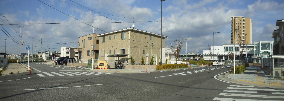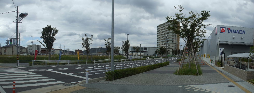 | 2011年8月15日。駅西口前の交差点。左が駅西口。正面から出る道路は南へ90°カーブ。ここも見た目、造