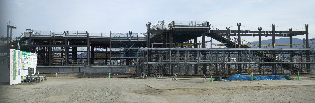 | 2011年3月13日。ホーム屋根の骨組みが出来ている。手前、副本線の分岐器が取り付けられている。
