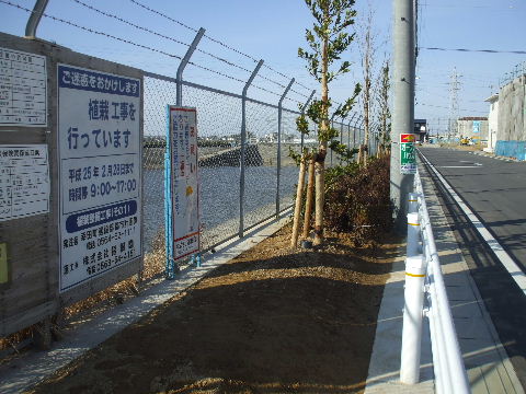 2013年2月3日。調整池脇の草ぼうぼうだった所が作り直されてい る。花や木は植えるのは簡単で肝