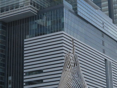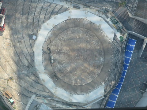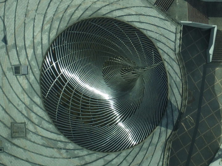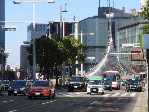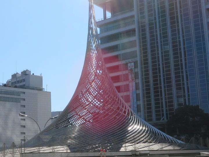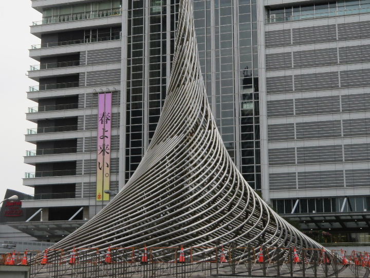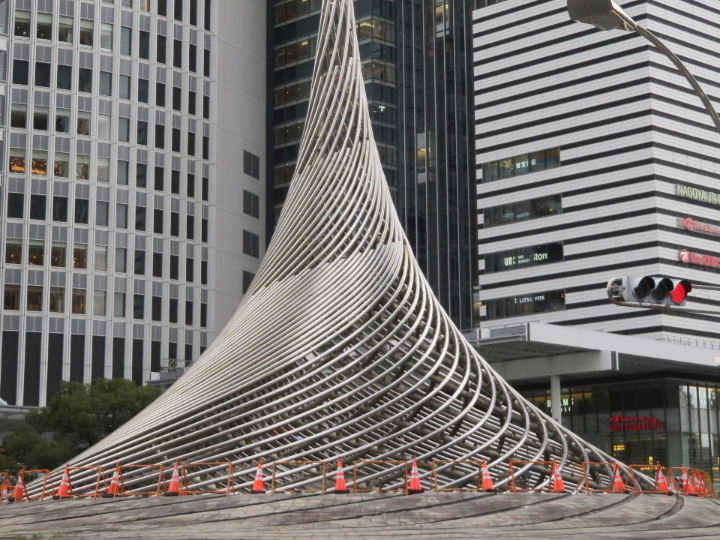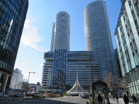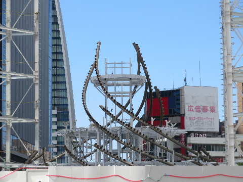 | 2018年01月26日。ミッドランドスクエア展望台からロータリー内に設置されているモニュメント・ 「飛翔」を見る。「飛翔」は1989年に完成。デザインは公開コンペに寄る。以前にあった銅像の 「青年像」は地下鉄六号線の工事に伴い工事後元へ戻る予定で一時的に地下鉄の日進工場 に保管されていたが結局新しいのを作ることになってここへは戻れず今は北区の名城公園に 設置されている。この「飛翔」も一部がささしまライブに移されることになっていたが取り止めに なり取り敢えず保管される。解体処分でいいような気がする。 |