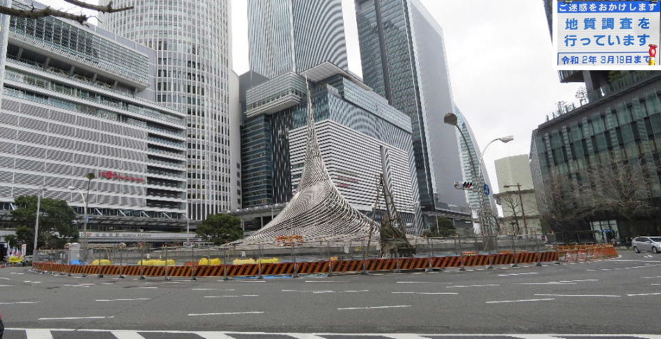 | 2020年02月23日。東から南側にかけてロータリー寄りの一車線が工事柵で囲われて小さい櫓が組まれロータリー撤去等工事に備えたこんな作業中。 |