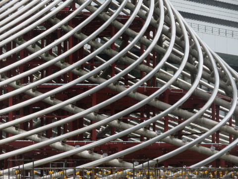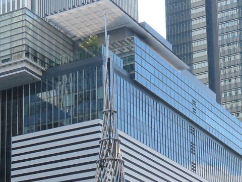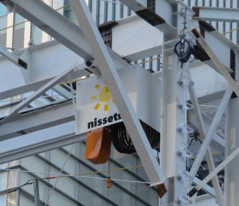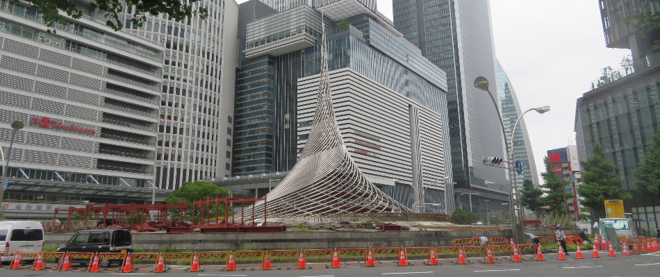 | 2020年02月02日。南東、名古屋ビル前から見る。 | 2021年03月06日。いよいよ撤去工事が始まる。先ず試しに 少し抜いてある。下から螺旋状に巻き上がっているパイプの 内、途中で止まっているものが無くなって左画像と比べると 下の方がスカスカになつている。 |