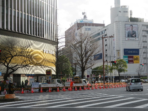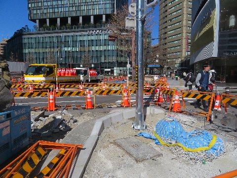 | 2023年02月12日。交差点南東側、名古屋ビル前でこういう 工事。飛翔の工事で1車線、この工事で反対側1車線が 塞がれてちょっと道が狭くなっている。 |