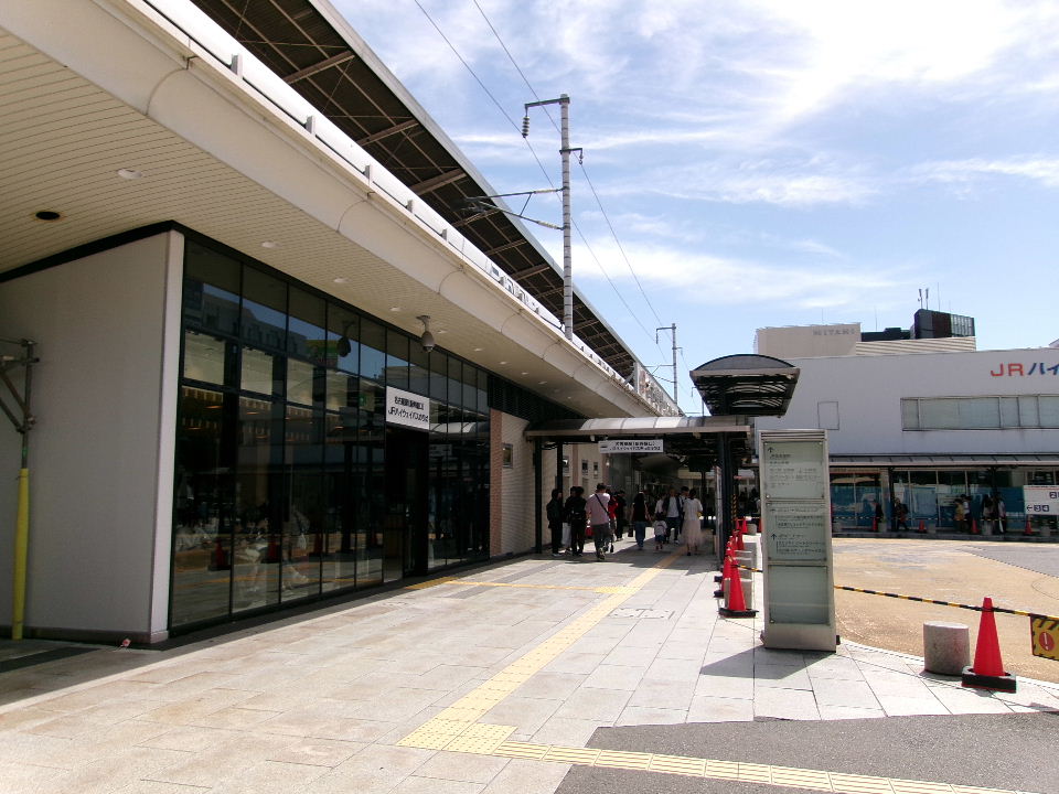 | 2025年09月21日。画像右の駅前にあるJRバスの切符売り場と交番が左のバスターミナル北へ移転。切符売り場は既に移転済み、交番は新しい建物建設中。 | |