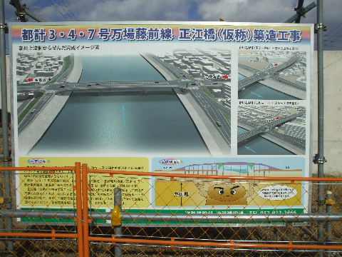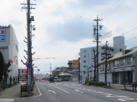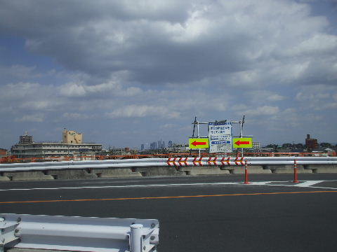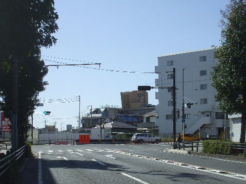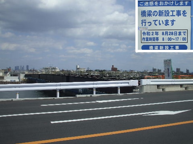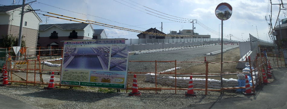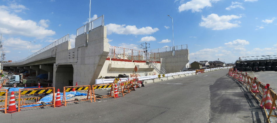 | 2020年03月15日。交差点突き当りの工事塀が無くなった。 | 2020年03月15日。アップで見ると先に新川堤防高さへ上がっていく高 架橋ができ上がりつつあるのが見える。 |