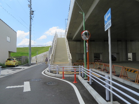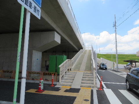 | 2020年07月12日。歩行者用階段つく。左、上流側には自転車用 スロープ付き、下流側には普通の階段。 |