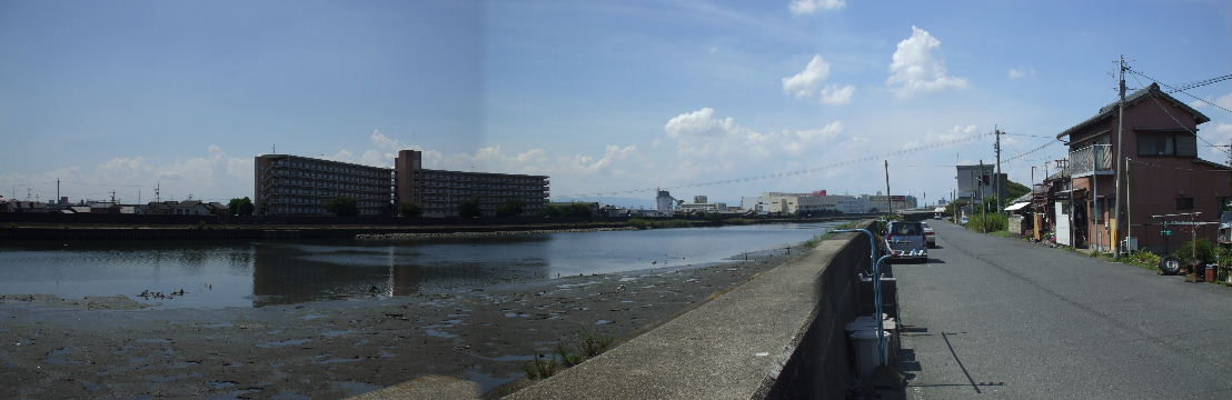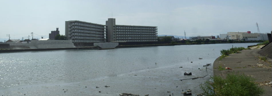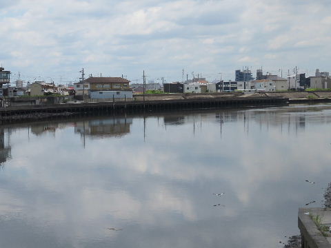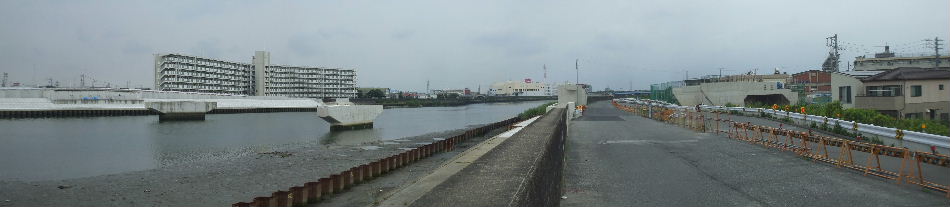| 2008年08月15日。対岸を南へ少し行くと港区南陽町に入る。対岸奥のクリーム色の建物の向う側を国道1号線が通っている。 | |