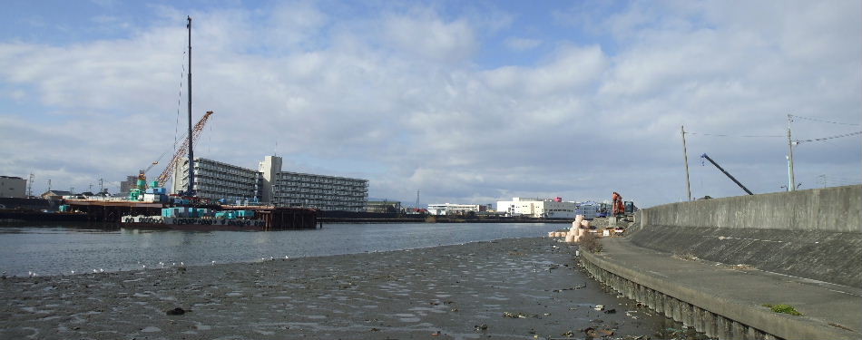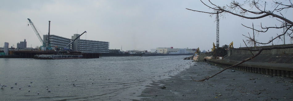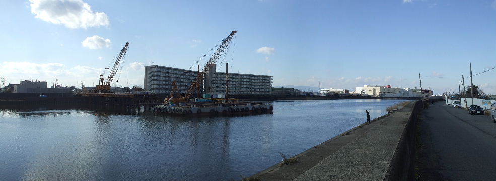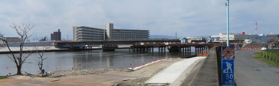| 2013年12月29日。西岸(右岸)から架橋工事中。重機を入れる仮橋を建設中のようだ。堤防の嵩上げも行われるので堤防沿いの建物の撤去も進んでいる。 | |