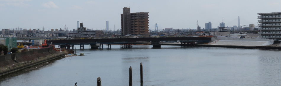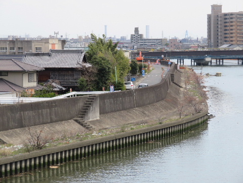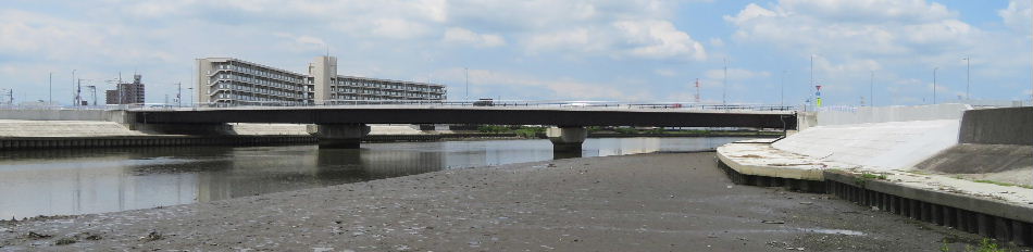 | 2020年03月15日。国道1号線三日月橋から見る。右岸、南陽町側の橋の前後は橋の高さに合わせて堤防が新しく作り変えられている。 | |