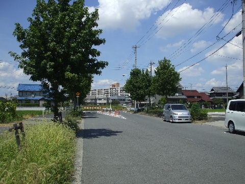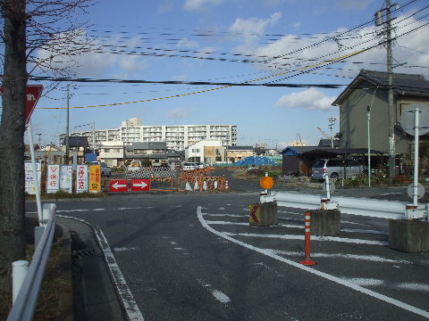 | 2008年08月15日。現在はT字路で突き当たりになるがその先用地の 取得が進んで空き地になっている部分があるのが見える。ここから緩 く右(西)へカーブして新川堤防高さまで登っていく。 |