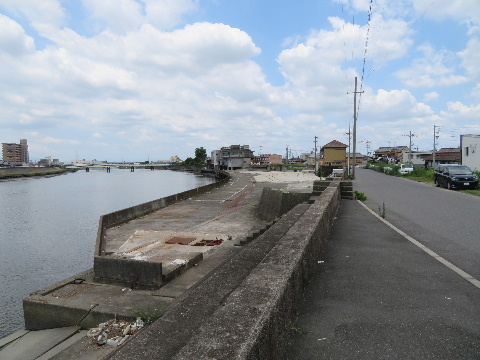 | 2021年07月25日。橋の袂から国道1号線方向を見る。 | 2021年07月25日。前後の堤防がまだ嵩上げされてないので 橋の袂までスロープ。下流側。 |
